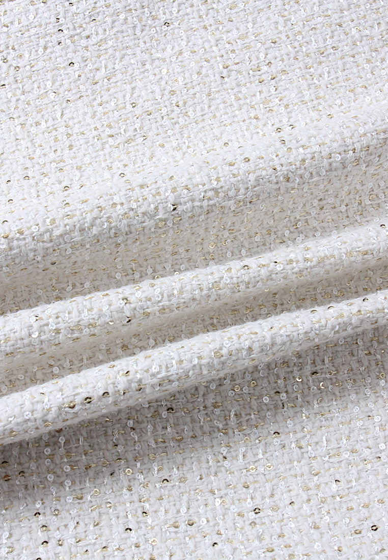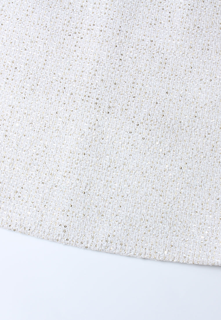 Structured white dress with mandarin collar, pearl frog buttons, and subtle textured finish. A modern take on heritage elegance—perfect for refined daywear or formal occasions.