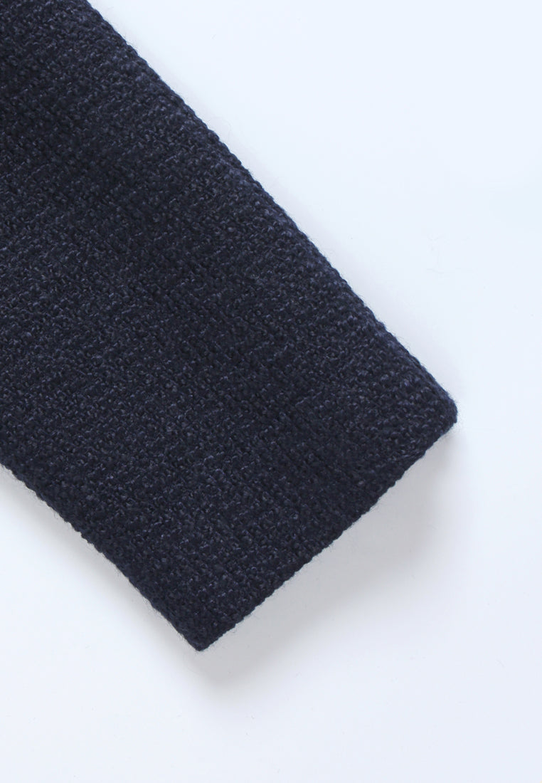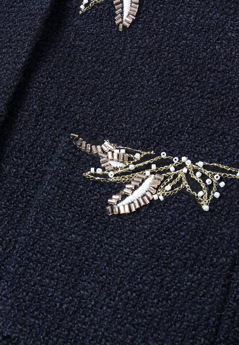 Navy tweed coat with metallic floral embroidery, structured silhouette, and flap pocket detailing. A refined outerwear piece with artisanal charm—ideal for winter occasions and elevated styling.