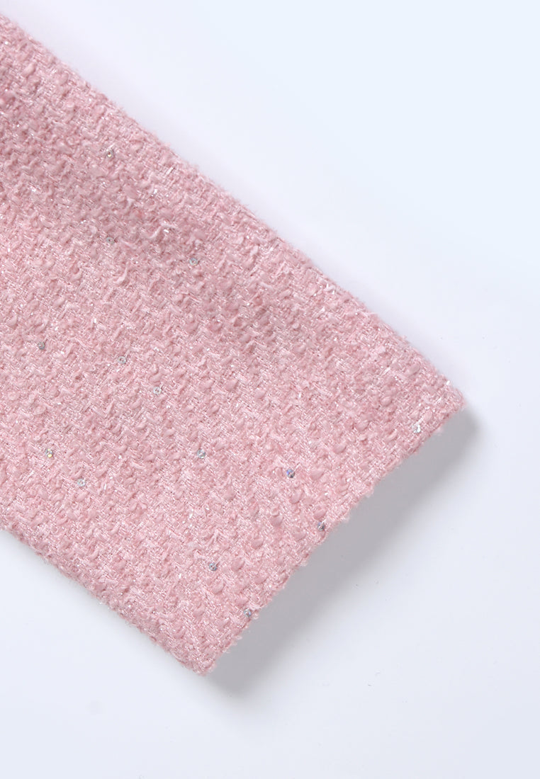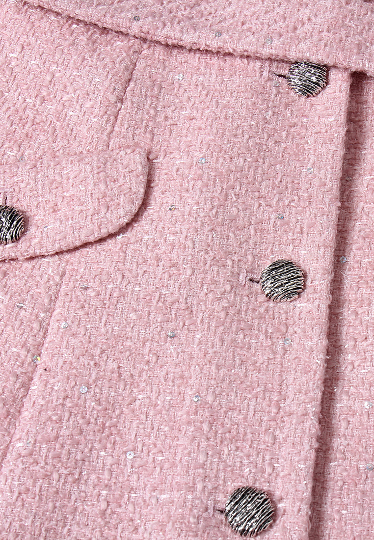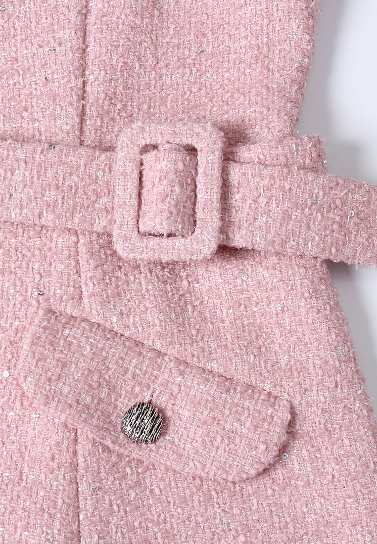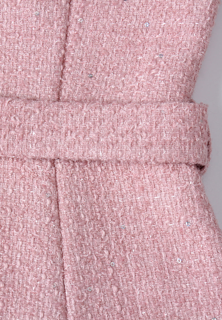 Pink tweed dress with jeweled button accents, matching belt, and flap pocket detailing. A tailored silhouette with festive sparkle—ideal for winter soirées and elegant daytime styling.