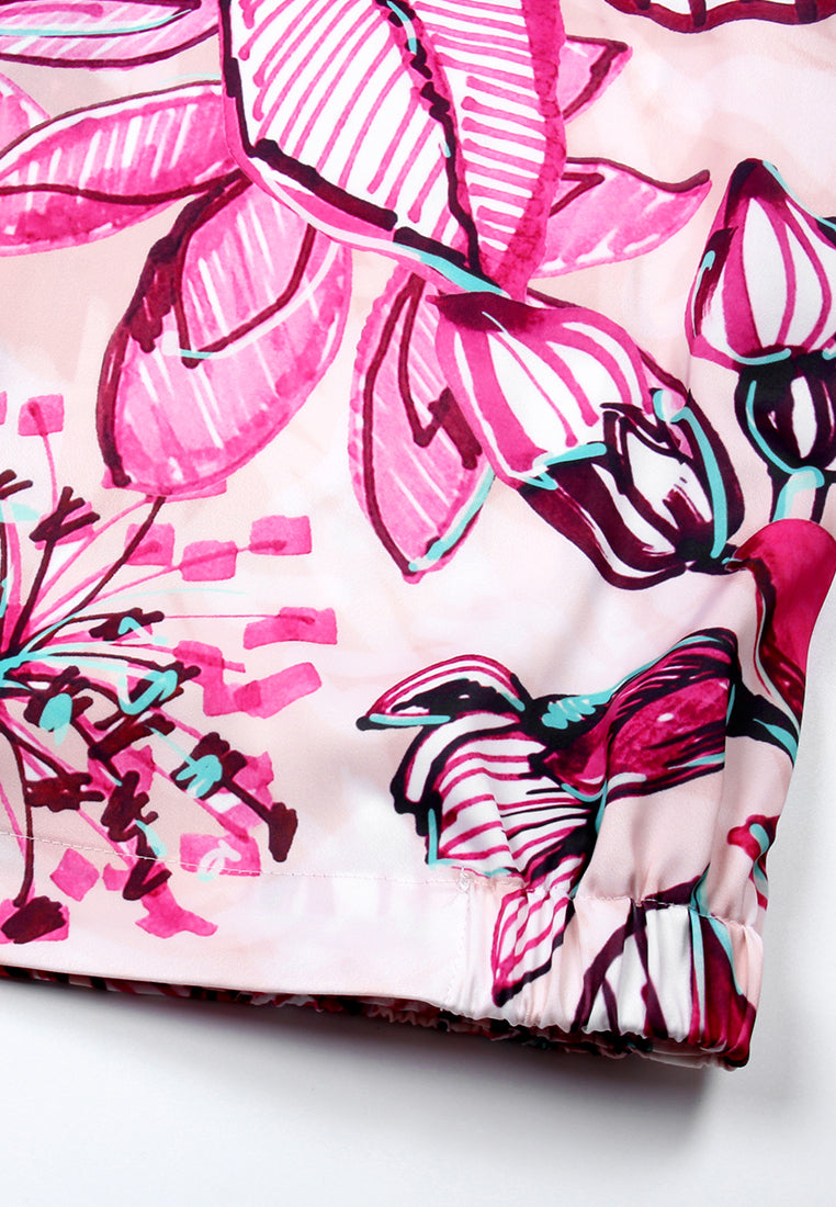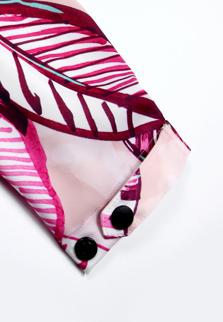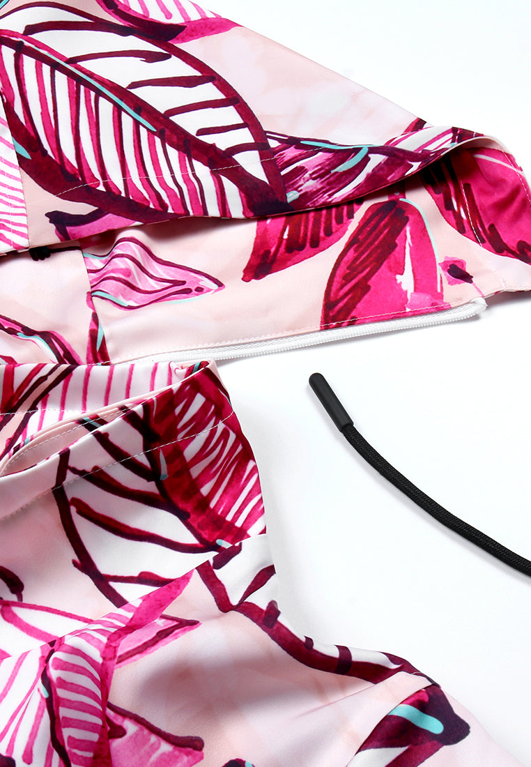 This hooded jacket features a vibrant leaf pattern in pink and purple tones, accented with black drawstrings and a front zipper closure. Its bold tropical design blends casual comfort with expressive style, making it perfect for outdo...Read More