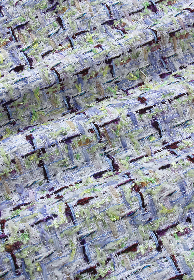 Multicolored tweed jacket with round neckline, three-quarter sleeves, and decorative silver buttons. A tailored silhouette with turquoise trim accents—perfect for semi-formal or professional occasions.