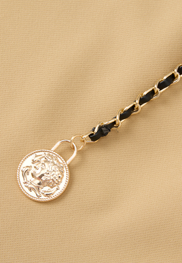 A pair of simple and neat chiffon trousers, keeping you cool and professional in summer days. Khaki tone sets an affable feeling. Slim fit silhouette showcase leg curves. Boasts a contrasting metallic chain belt with a plaque charm.Read More