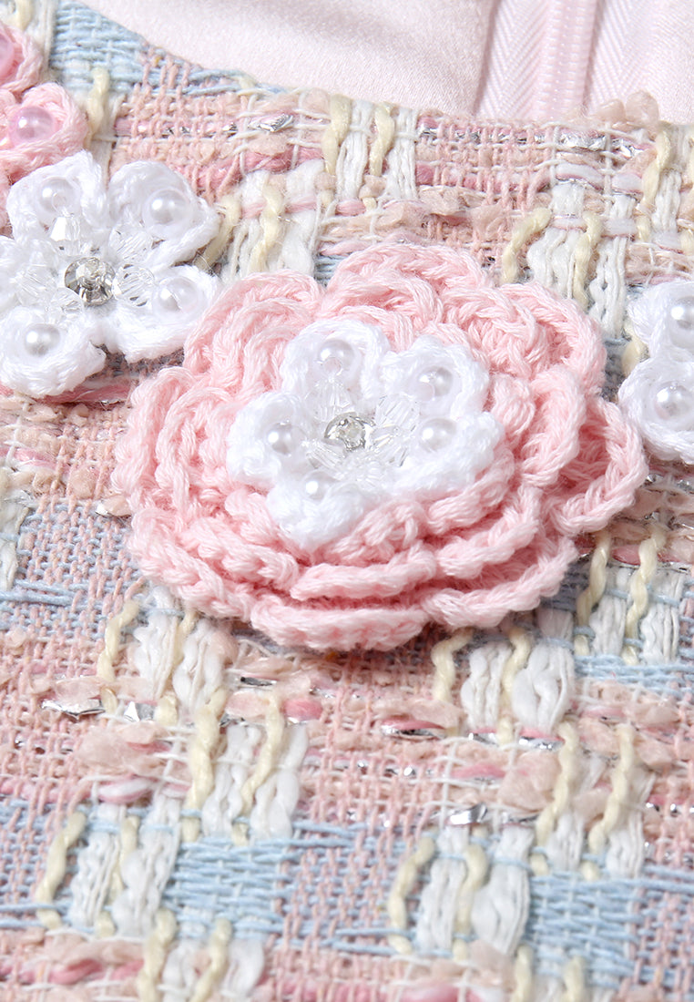 Pastel tweed dress with floral appliqué at neckline and pockets. Features a fitted silhouette and three-quarter sleeves for refined daytime elegance.
