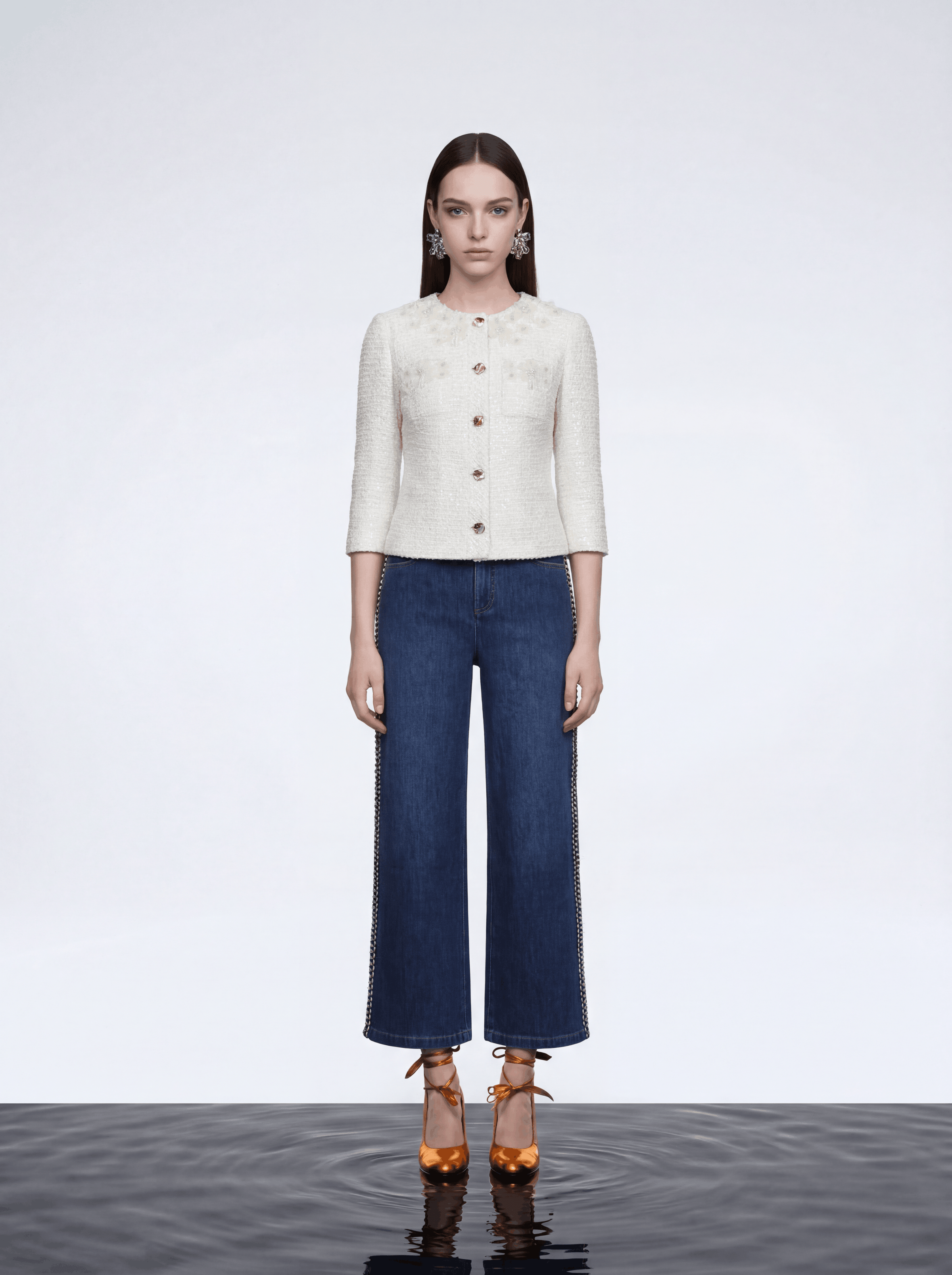 Dark blue denim wide-leg jeans with a classic five-pocket design, button and zipper closure, and distinctive decorative frog loop trim along the outer seams. Blending timeless denim styling with unique embellishment, these jeans offer...Read More