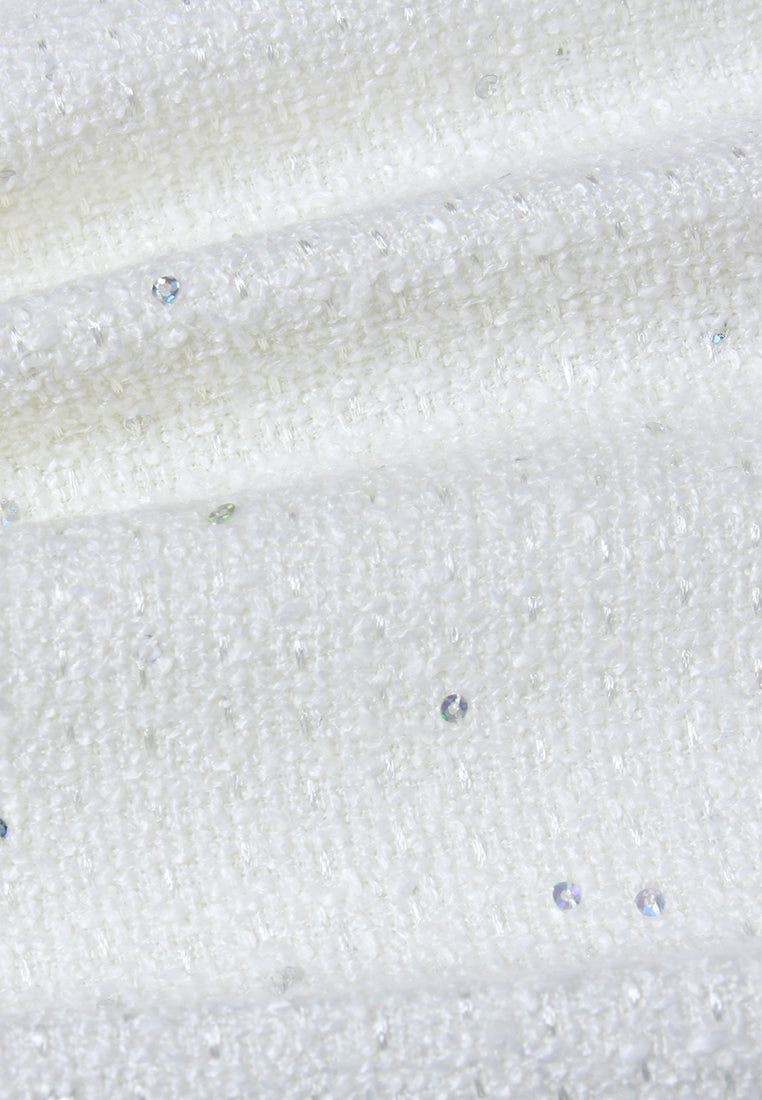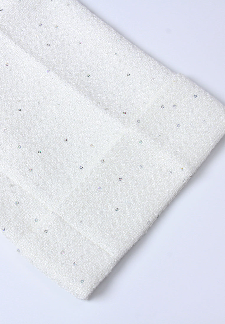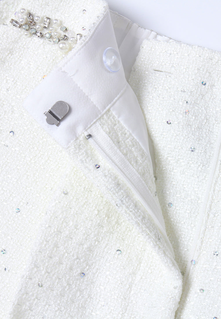 A pair of chic tweed trousers, made for businesswomen who want to stay stylish in their workdays. White tweed scattered with flickering sequins. Embellishment made with pearls, crystals, beads, and tiny bows alongside the waist.    Read More
