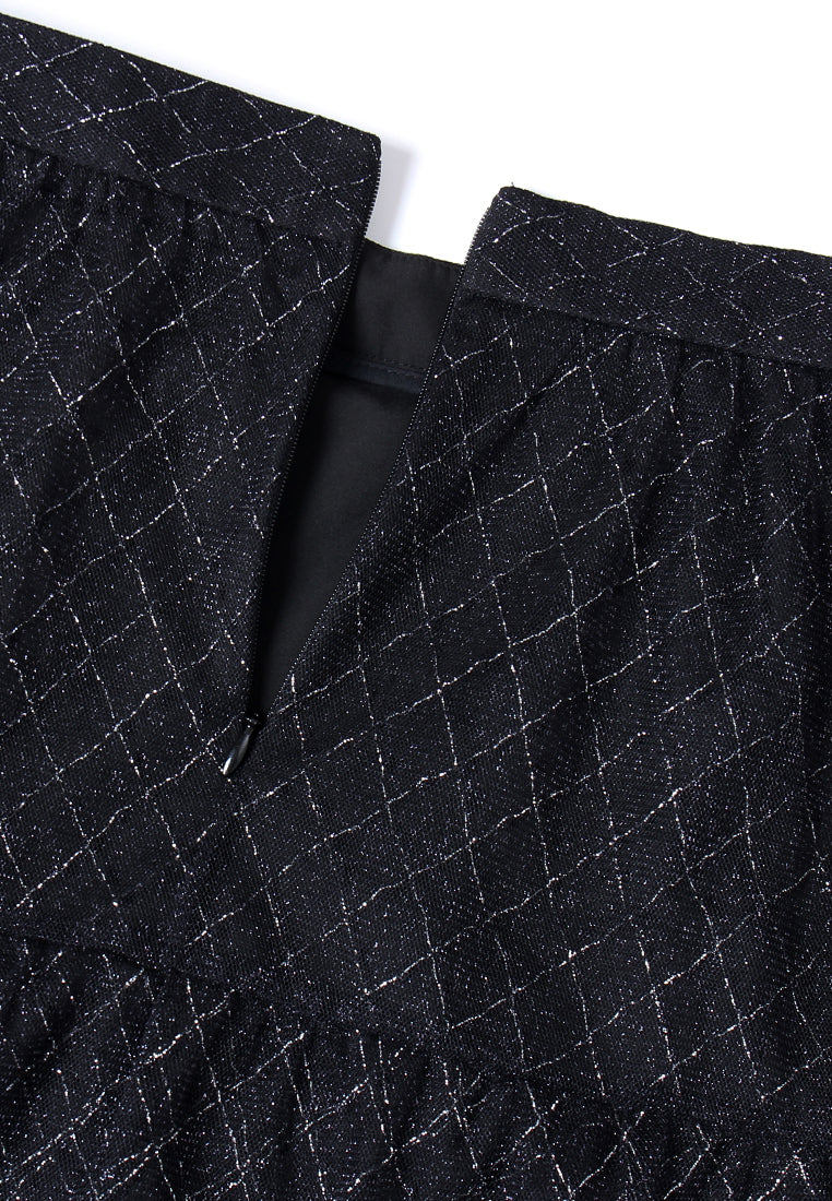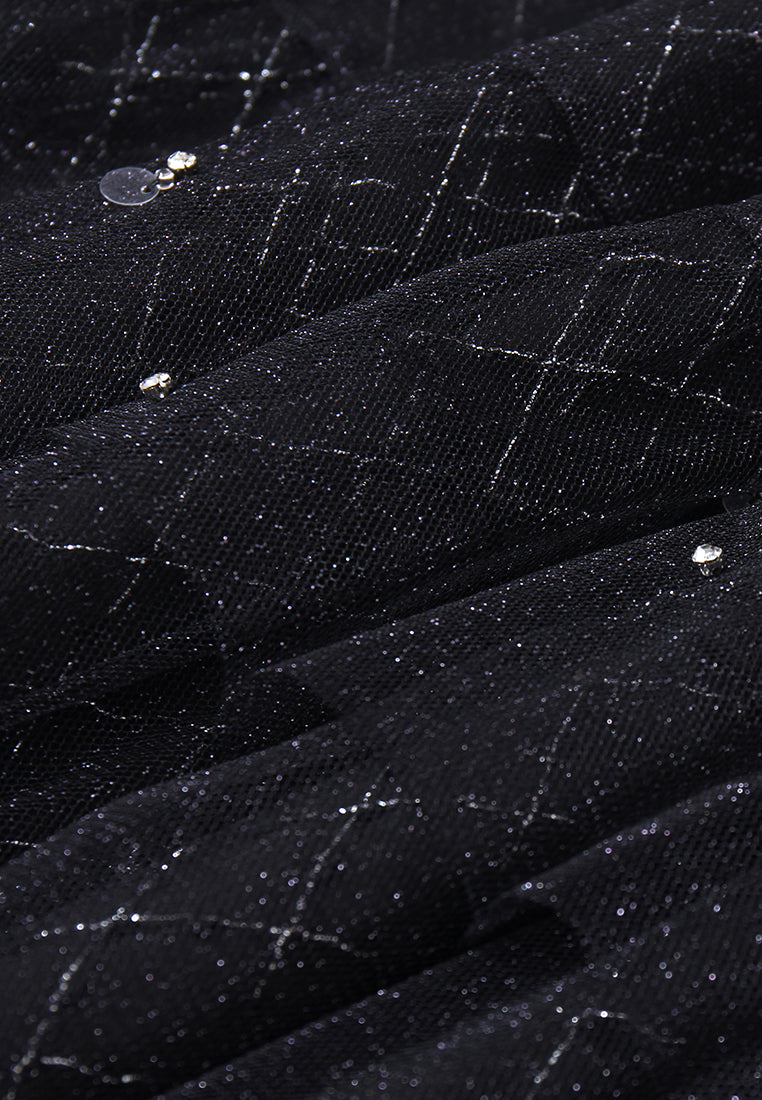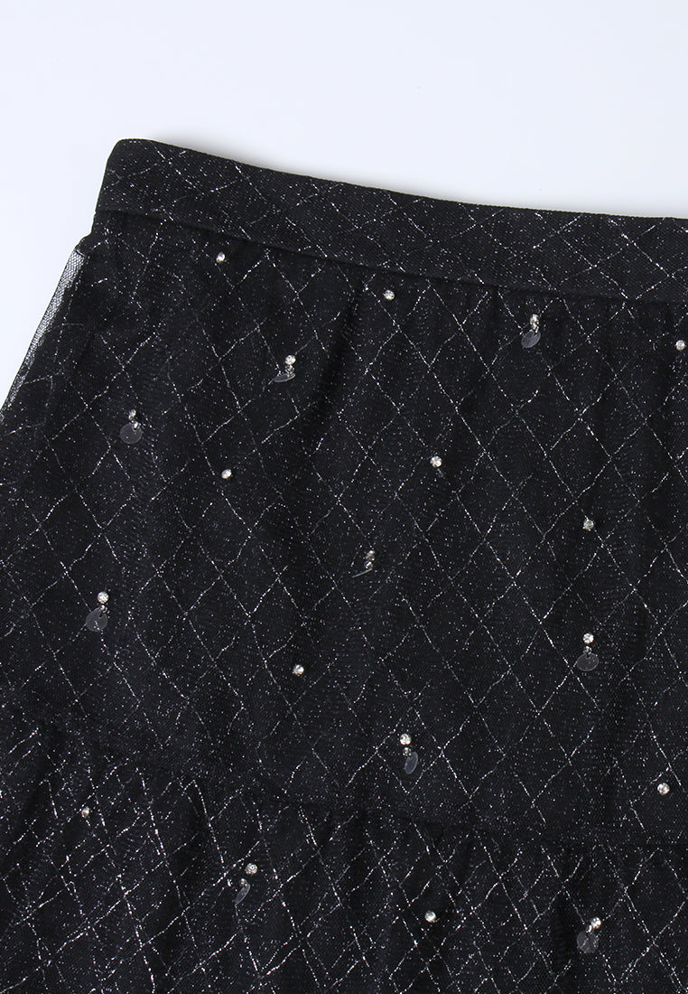 Black high-waist tulle skirt with tiered layers and grid-pattern sequin embellishments. Flared hemline adds movement and elegance—ideal for evening wear or statement styling.