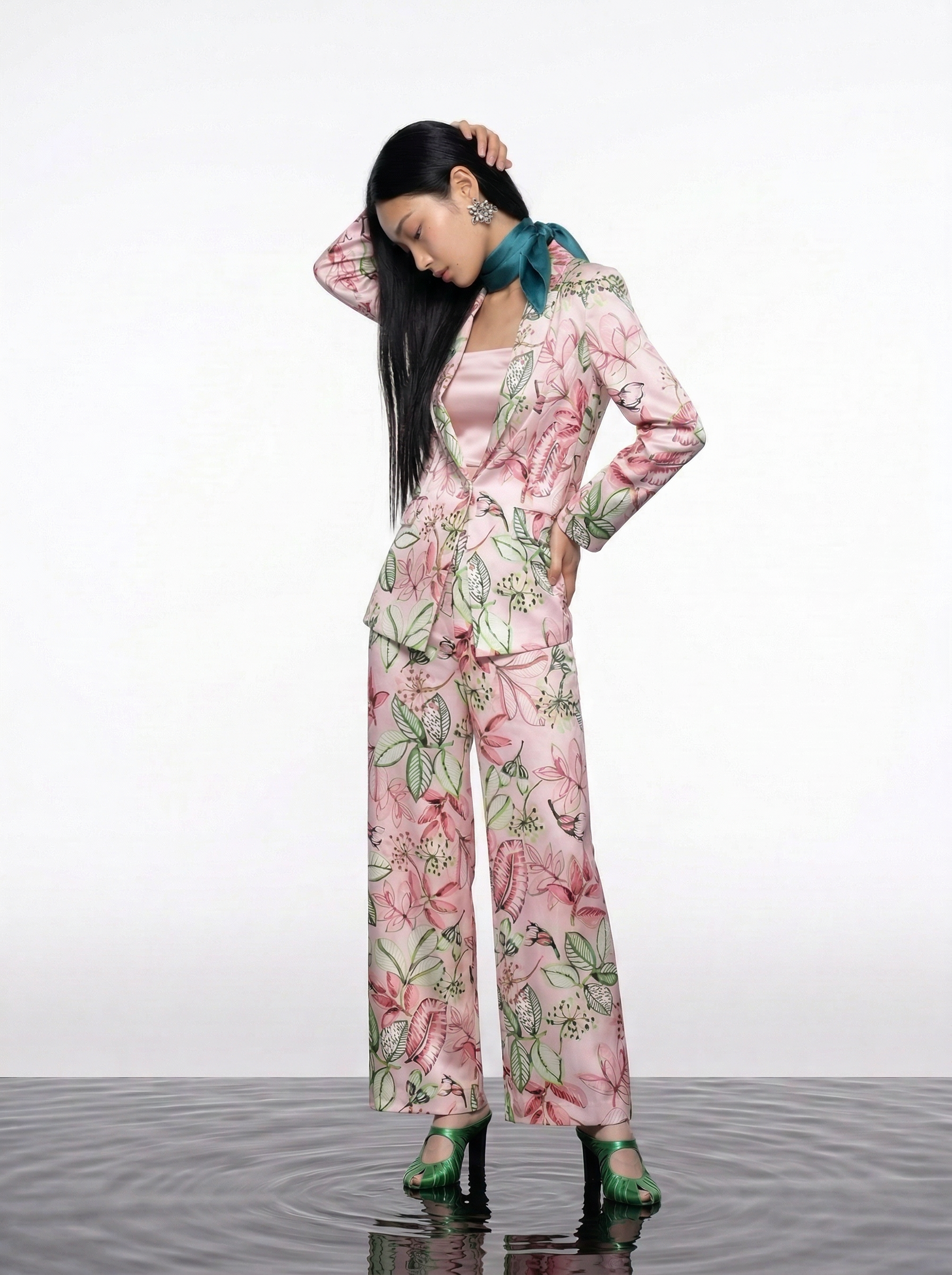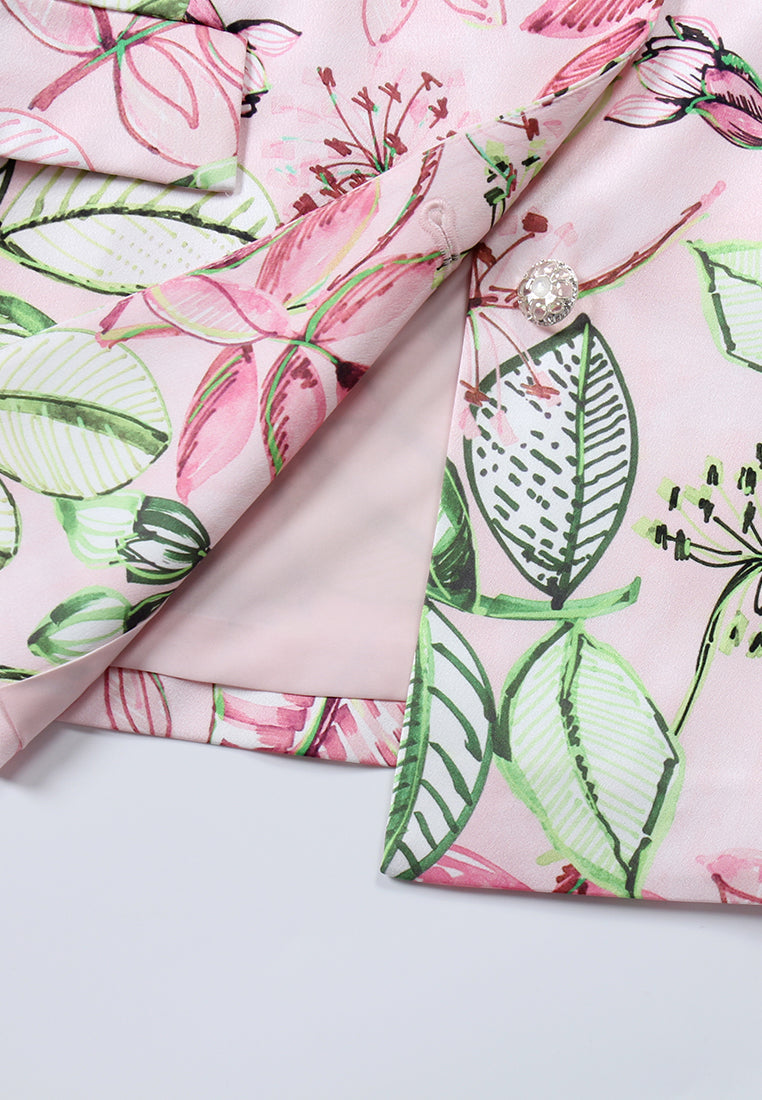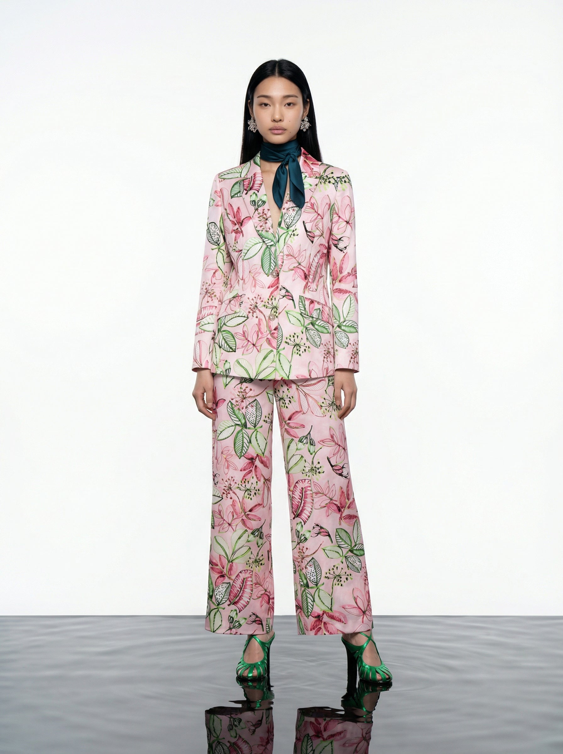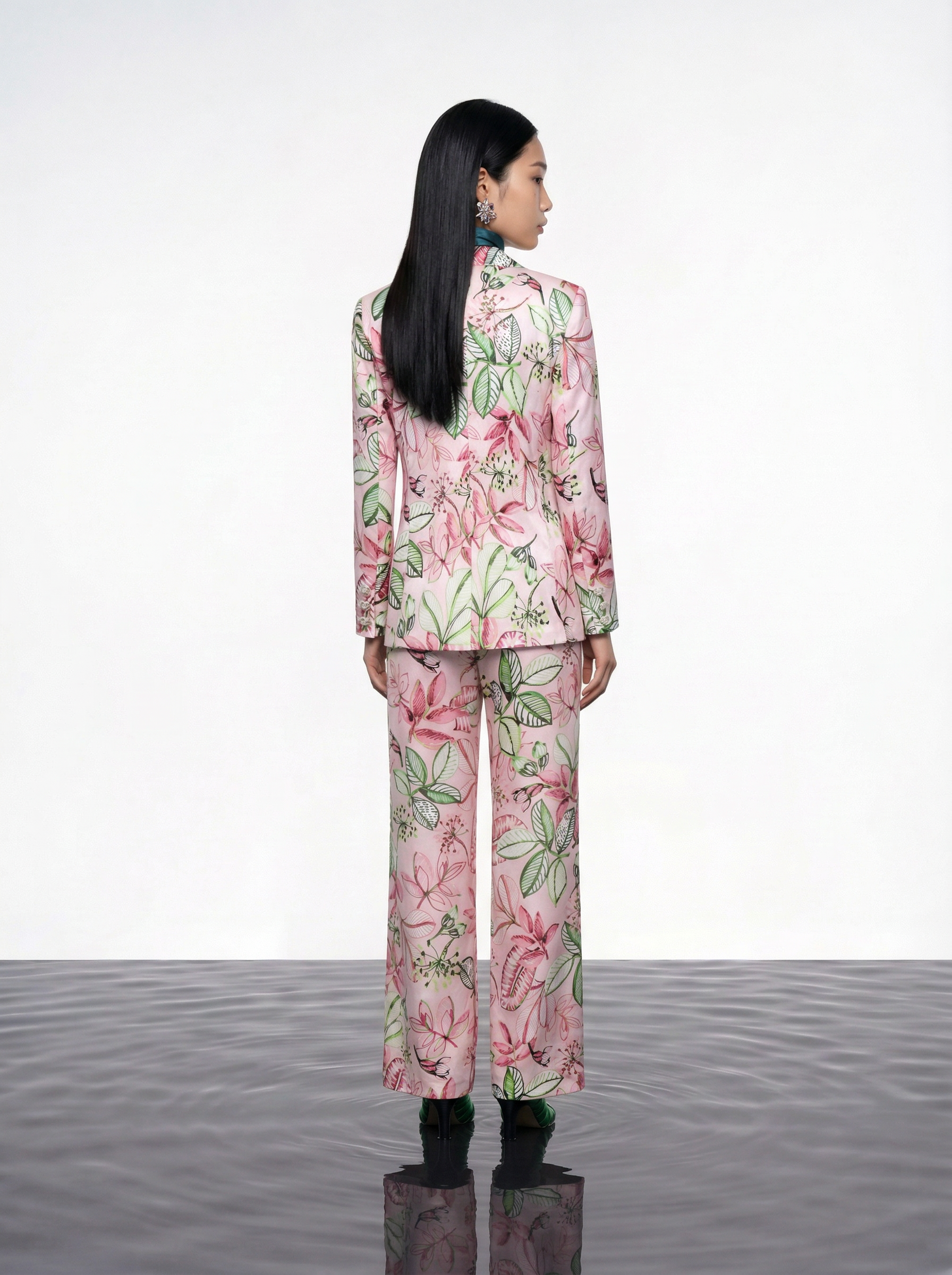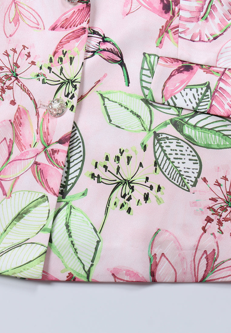Light pink tailored blazer with vibrant botanical print and single-button closure. A bold silhouette with artistic detailing—perfect for spring and summer statement dressing.