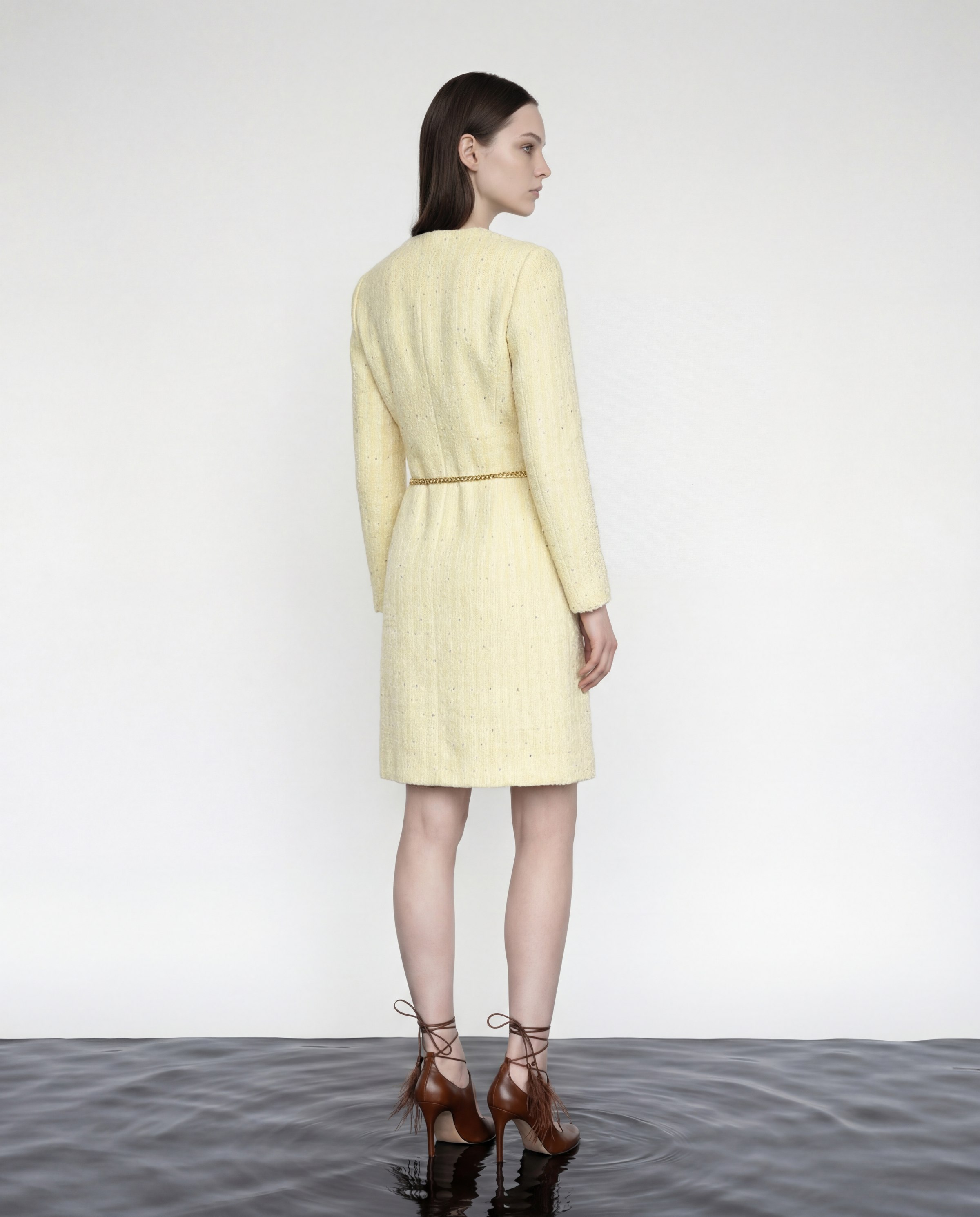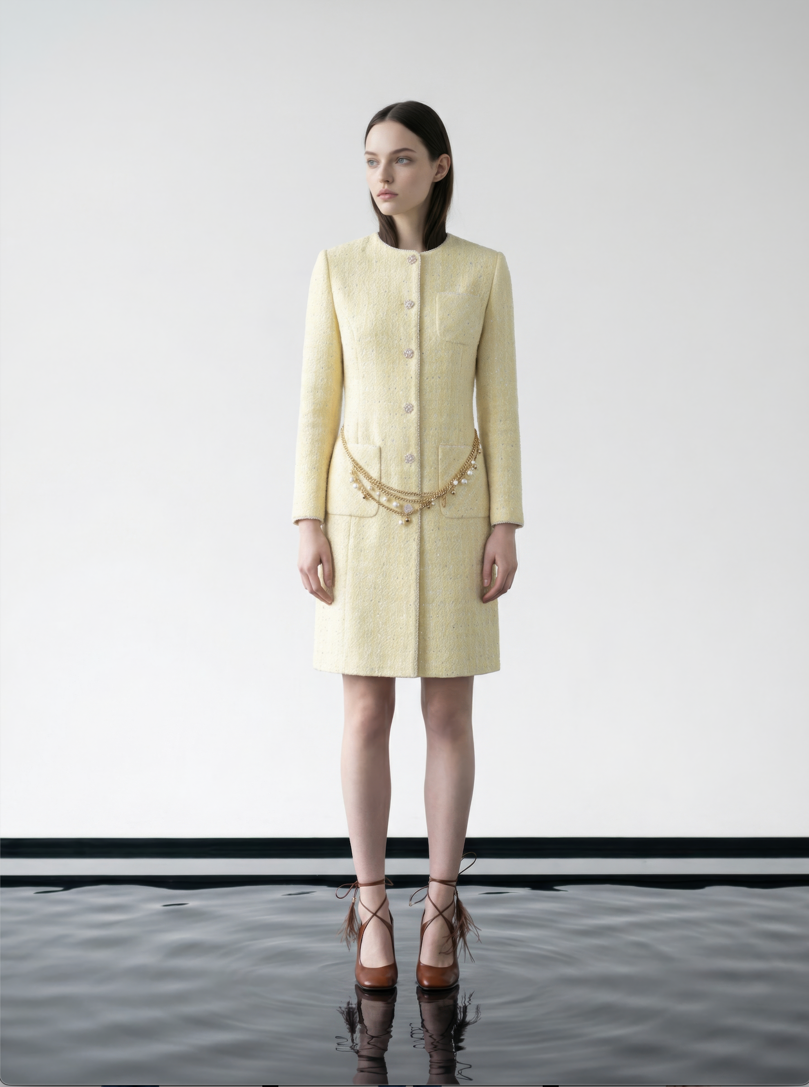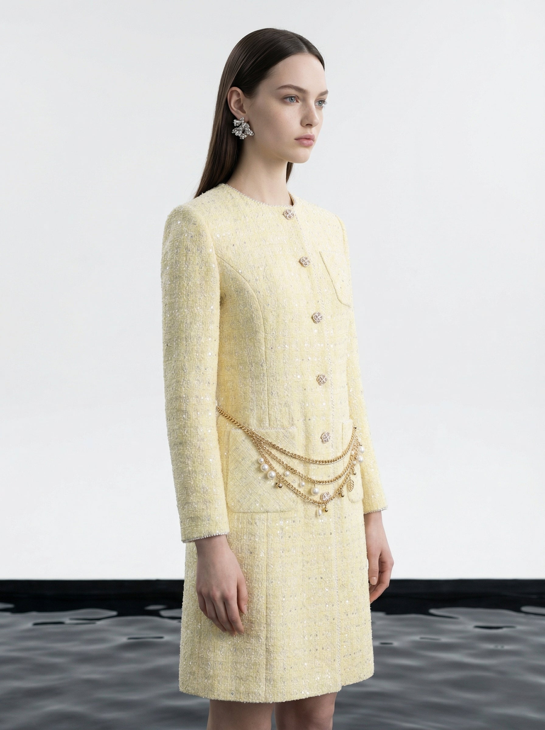 Golden Tweed Coat with Pearl Chain Belt