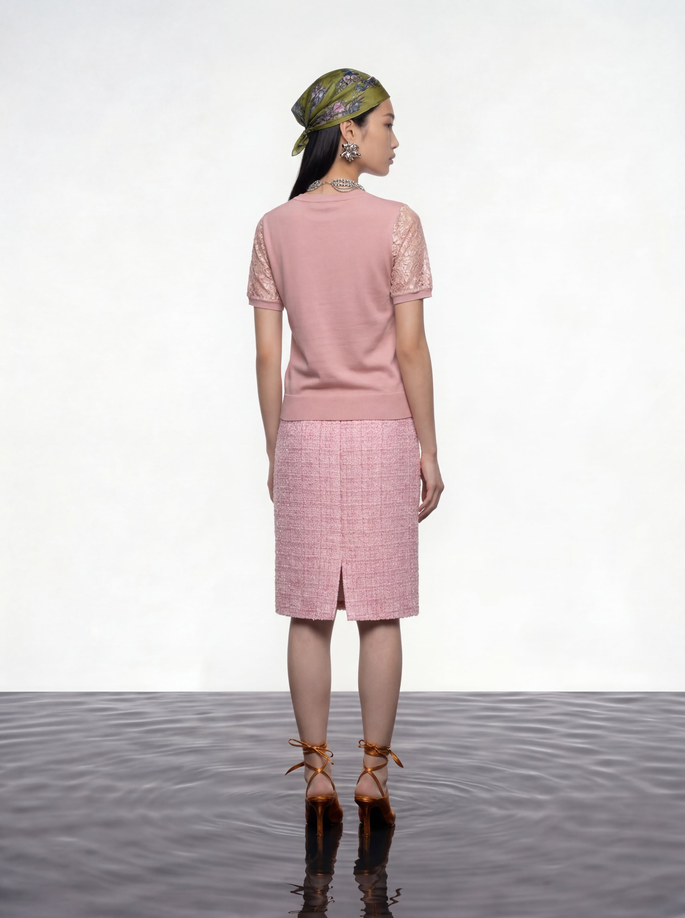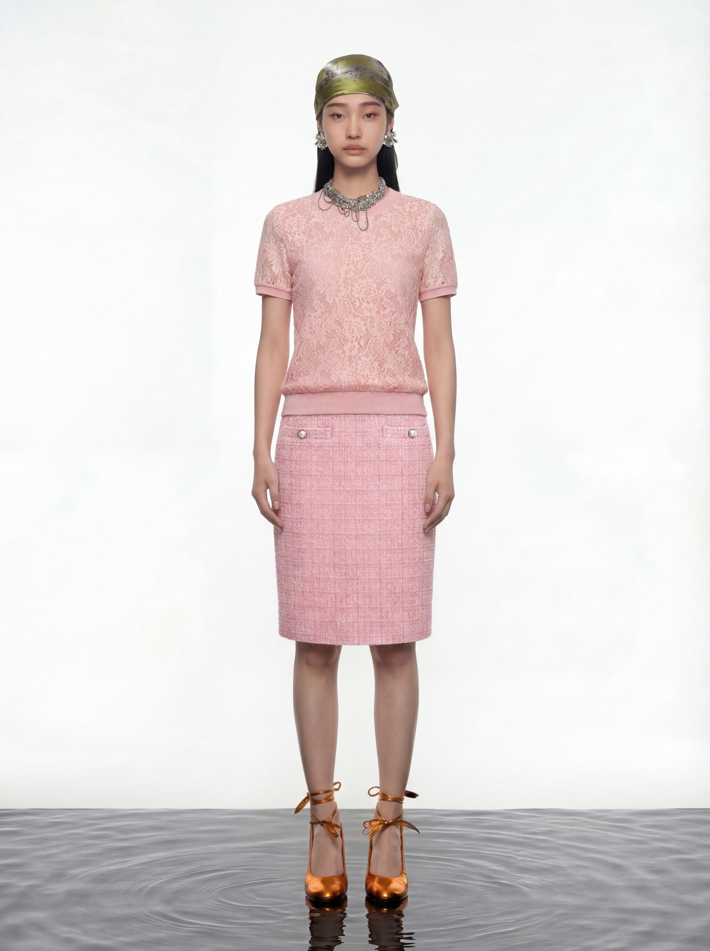 Pink lace short-sleeve top with floral overlay and sheer texture. Featuring a round neckline, ribbed collar, cuffs, and hem in solid pink fabric, it balances delicate lace with structured accents—ideal for casual chic or semi-formal s...Read More