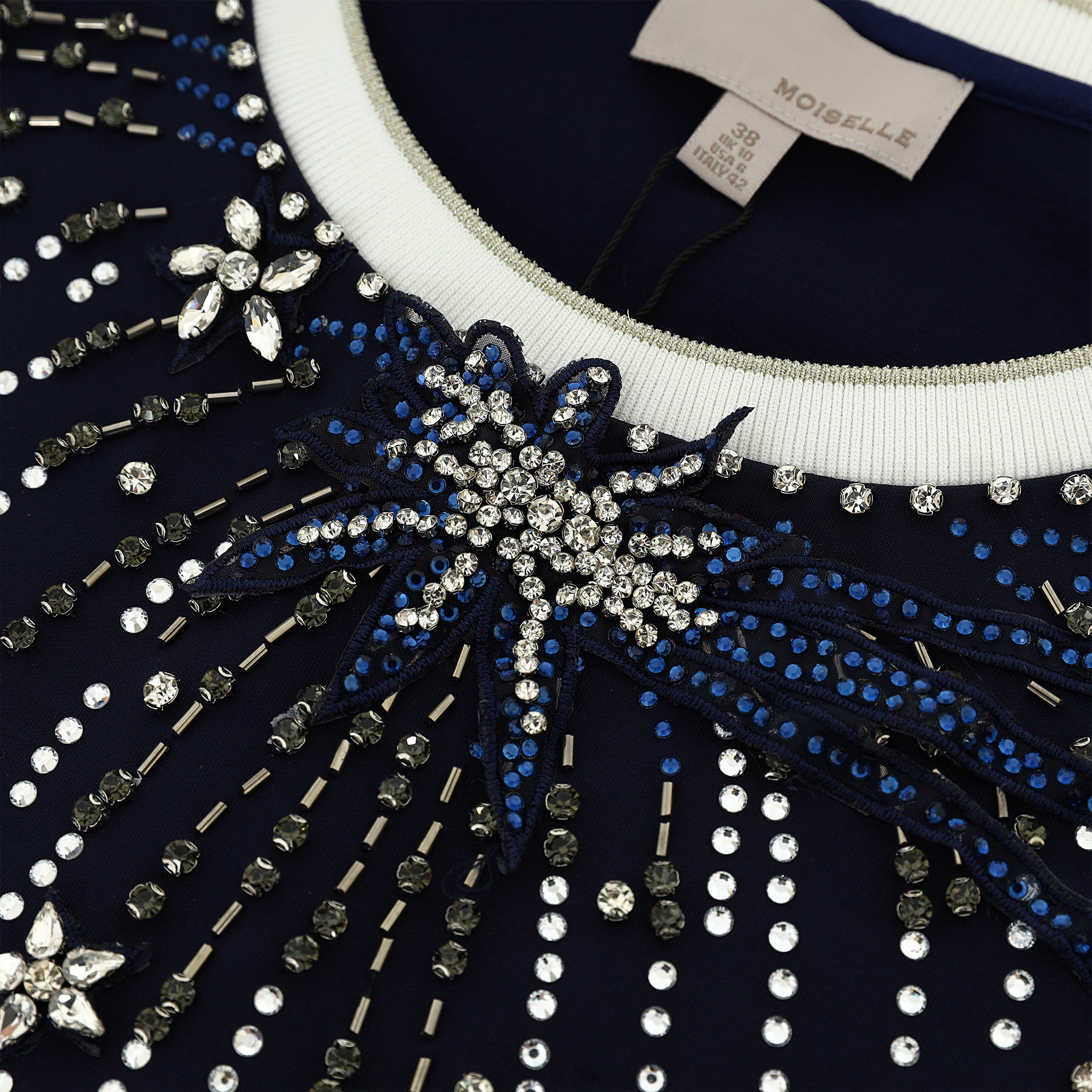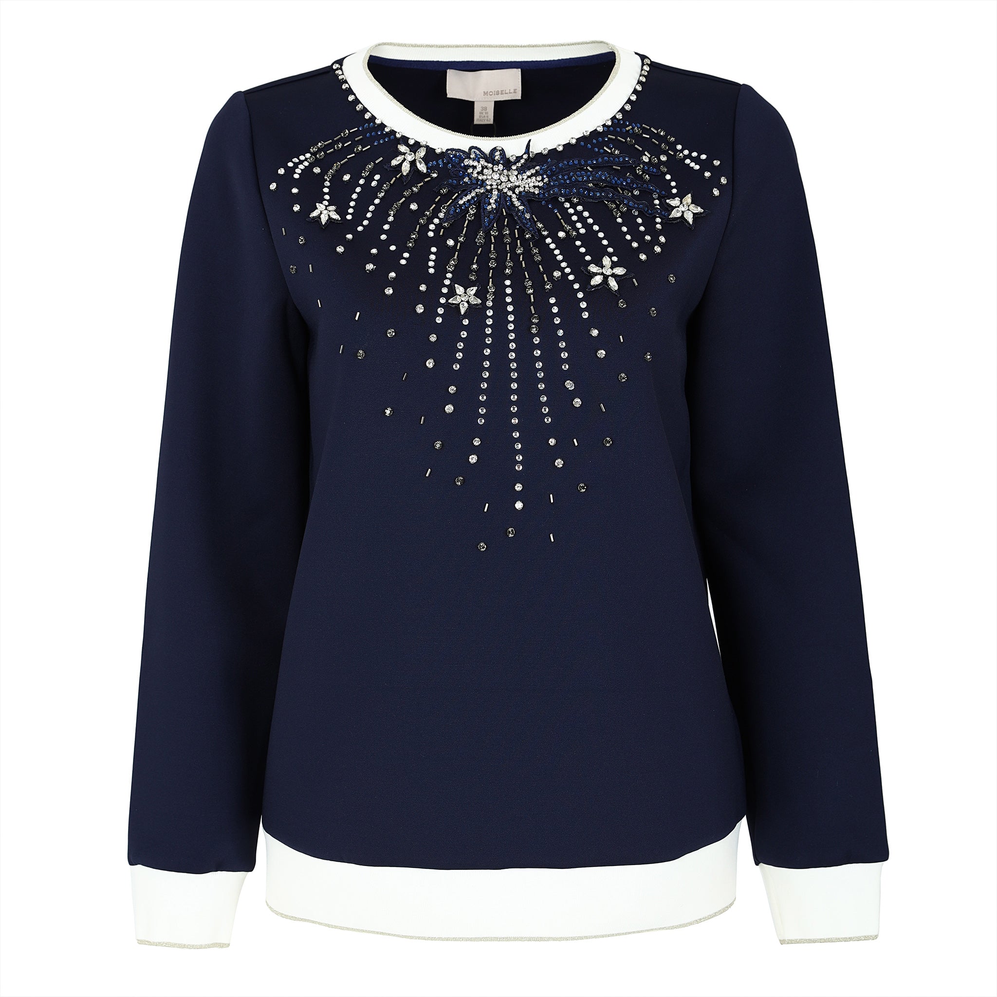 The contemporary long-sleeve cotton T-shirt is so cozy and versatile. It's embellished with shiny crystals, as dazzling as fireworks.